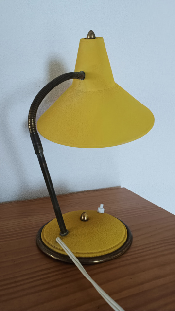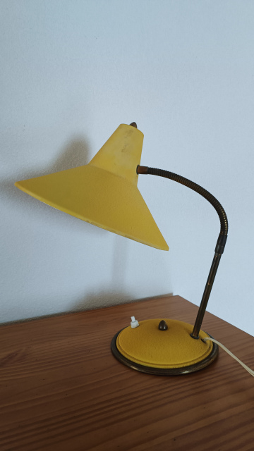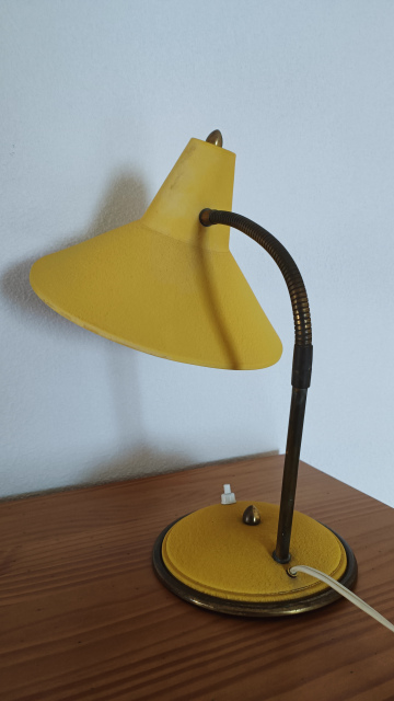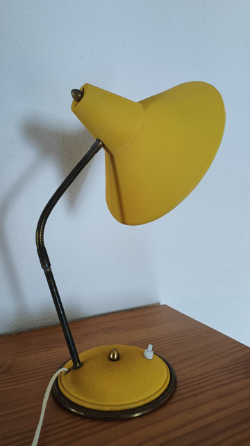 Unieke vintage bureaulamp van het Nederlandse merk Herda, model 9, uit de jaren 50/60. Deze lamp is uitgevoerd in een opvallende mosterdgele kleur met een flexibele zwanenhals en messingkleurige details. De metalen kap is draaibaar en kantelbaar, ideaal voor gericht lees- of werklicht. De originele tuimelschakelaar bevindt zich op de voet.