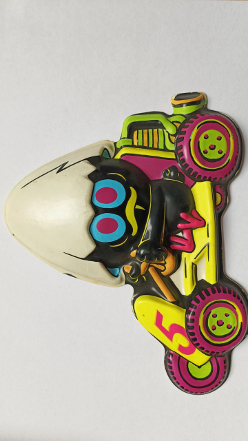 Calimero in Race Car, rare and colorful wall decoration featuring Calimero, the iconic little chick with a half eggshell on his head, driving a race car with the number 5.